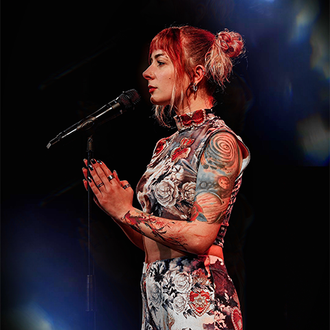 Teintée par son timbre rauque et son énergie contagieuse, sa musique est un murmure à l’oreille autant qu’un cri de guerre. Dans son «bouillon de genres musicaux» se dessine un «pop-rock» bien à elle, dont la recette pourrait aussi bien révéler du Disiz, du Yseult, du Zimmer, que du Queen. Elle singularise le tout par sa plume – sensible, réfléchie et sans filtre – qu’elle signe en rouge vif incandescent. La musique se lance : ses